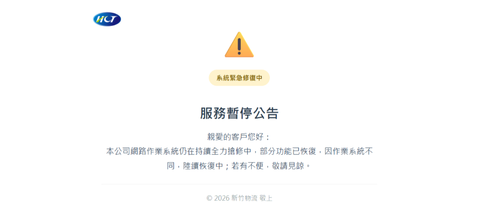 新竹物流系統與網路自17日發生異常後,至今已超過24小時仍未完全排除,導致出貨、配送等多項核心服務持續中斷,整體物流作業嚴重受影響。業者今(4/18)日持續透過官網公告說明,強調目前仍在全力搶修中,並對造成的不便向用戶致歉。
