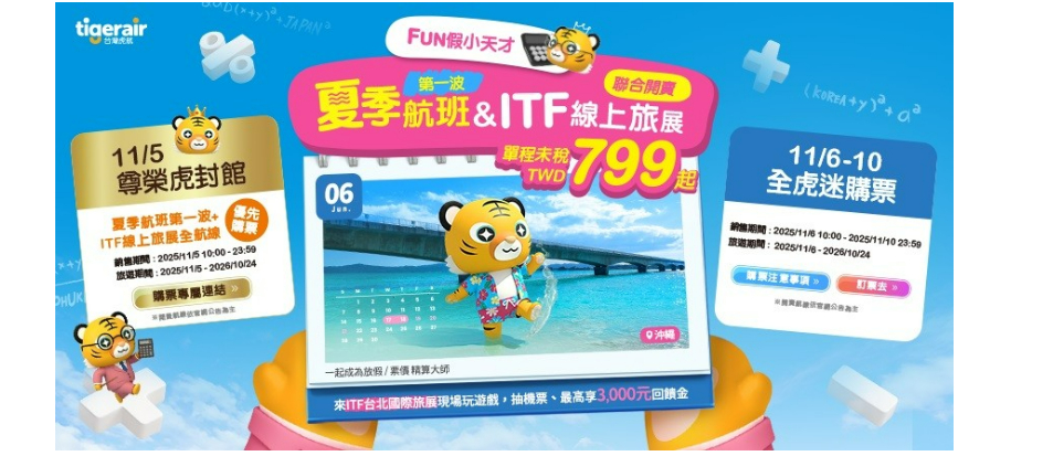 明(2026)年度將有9個3天以上的連續假期,可望將帶動一波強勁的輕旅行熱潮,看準民眾已開始規劃明年度的旅遊,台灣虎航將於明(11/5)日針對尊榮虎(tigerprime)的會員,搶先同步推出2026年夏季班表開賣及2025ITF台北國際旅展線上促銷的單程未稅價799元起的優惠價,讓虎迷們可以超前部署明年的假期。