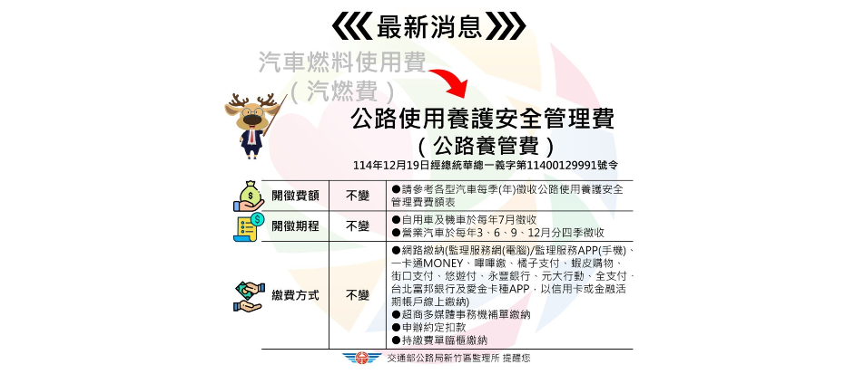 立法院去年12月2日三讀通過修正《公路法》部分條文,將原「汽車燃料使用費」正式更名為「公路使用養護安全管理費」,簡稱「公路養管費」或「養管費」,不過開徵期間、繳費方式及金額維持不變。新竹區監理所中壢監理站提醒,繳納期限到今年3月31日止,未依限繳納者最高可處3000元以下罰鍰,請車主儘速繳納。