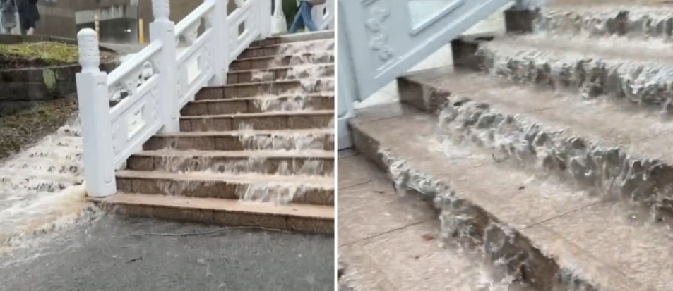 中央氣象署指出,颱風外圍環流與東北季風共伴影響,北部及東部地區降雨顯著,甚至從雨量預測來看,北台灣不少縣市已經達到停班停課標準。今天(10/20)雖然是正常上班上課,但許多北部學校風強雨驟,位在新北淡水區的淡江大學,樓梯被大雨淹成「瀑布」,更有大樓外牆磁磚不明原因砸落,校方也趕緊將部分地區警戒,暫時不讓學生通過。