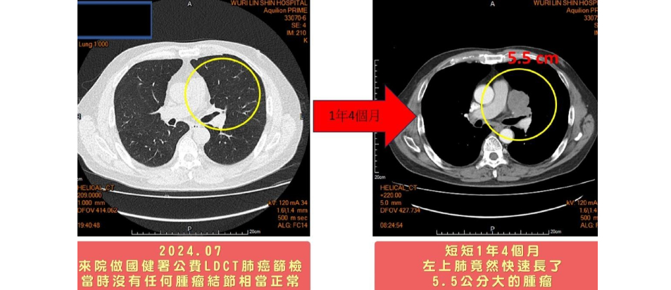 台中一名63歲黃姓男子每天都要抽兩包菸,菸齡長達40年之久,日前他接受國健署提供的公費低劑量電腦斷層掃描肺癌篩檢,檢查結果正常,但短短1年4個月後,竟發現左上肺長出5.5公分大的腫瘤,烏日林新醫院癌症副院長暨胸腔內科許人文醫師診斷為「小細胞肺癌」末期,不治療的話存活期僅剩3個月,但在化療、胸部放射線照射治療後成功擊退「癌王」,黃男趕緊戒菸,遠離肺癌威脅。