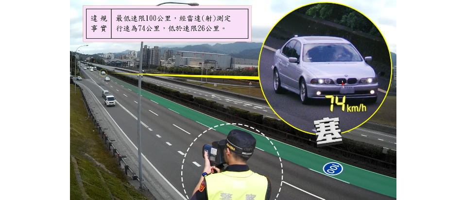 國道行車不僅超速會受罰,若「太龜速」也可能違規。國道公路警察局今(3/20)日透過官方社群發文宣導,提醒駕駛人慢速車不得占用內側車道,並公布一個取締案例,一輛白色BMW行駛於最低速限為100公里的國道路段,經雷達測速僅74公里,低於速限達26公里,已構成違規,依法開罰。